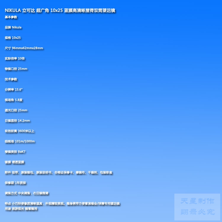 NIKULA 立可达 超广角 10x25 蓝膜高清晰屋脊双筒望远镜
