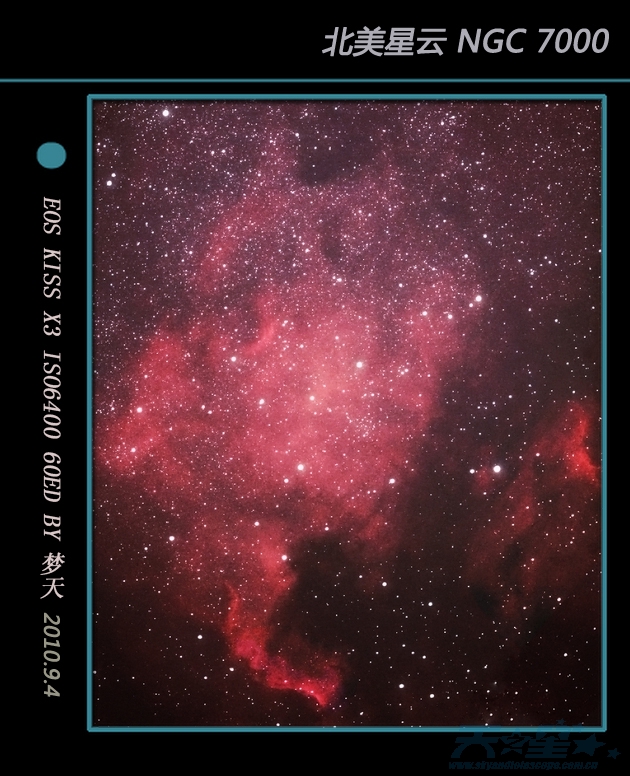 本帖最后由 jxskyinfo 于 2010-9-6 21:56 编辑 市区强光害下的NGC7000北美星云 大马路边来往汽车没有停过,角度对了快一个小时,真是累,结果还是没对正,郁闷。