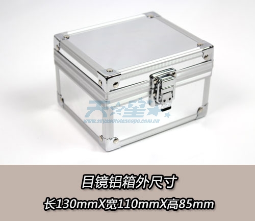 材料: 框架:铝合金 蒙皮:银白色ABS板 内部:EVA板+海绵 锁紧方式:板扣锁 重量:300克 铝箱适合于5,6,7,8,9mm的tmb目镜