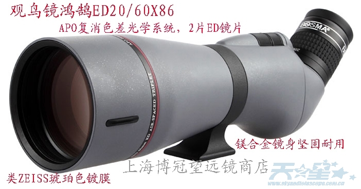 目前观鸟镜很少有口径大于80毫米的。这款观鸟镜-鸿鹄20-60X86口径达到86毫米,含2片ED,色彩还原更逼真。APO光学设计。1:3双速调焦,对焦更精确。镁合金防水镜身。配置相机转接器,支持全画幅摄影。视场:1.1-1.1度 ...