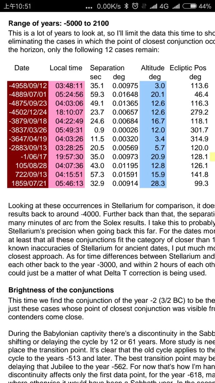 rediscovering-appendix-b.pdf StatisticalAnalysis9400YearsVenusJupiterConjunctions.pdf Great Planetary Conjunctions for the HP-41:网页链接 VENUS-JUPITER CONJUNCTION (GEOCENTRIC TROPICAL ZODIAC) 2001 to 2100 CE:网页链接 Mutual Planetary Occultations Past and Future Their Observation Circumstances:网页链接 StatisticalAnalysisof9400YearsofVenusJupiterConjunctions basedontheSolexProgram developedbyAldoVitagliano,andwithsupportfromAllanJohnson:网页链接 VisibilityofVenus/Jupiterconjunctions Lookingattheexceptionallyclosecases,oflessthanaminute(.0167degree)separationO网页链接 意大利天空现象网(pierpaoloricci.it)由solex软件计算而得