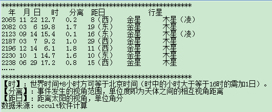 延伸阅读(万年内的事件)9400年内事件 利用solex软件计算9400年内的金星最接近木星事件。 公元前5175年到4164年之间的合事件共计9900个事件。 在公元1900-2100年之间金星与木星距离最接近且间隔短时间出现的事件为 210个: 111次或52.8%,12-14个月之间的时间间隔