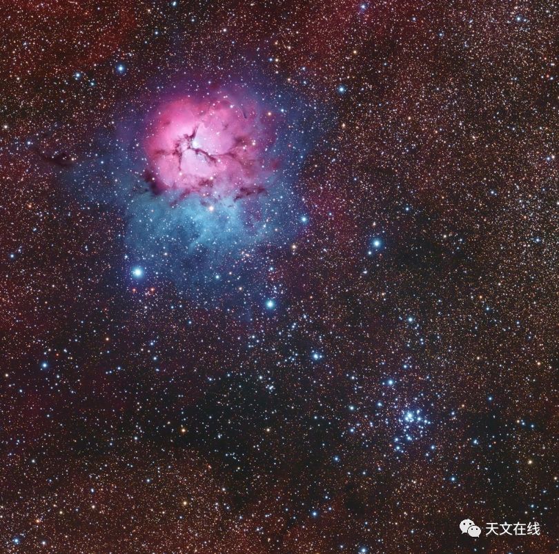 说明: 亦名为M20的美丽三叶星云,位在星云密布的人马座之内,是一个小望远镜轻易可见的天体。 在这张跨幅1度的影像里,距离约5,000光年远的三叶星云,与右下角的疏散星团M21分享了这片取景佳妙的视野,构成了探索天体对比的多彩案例。 受到尘埃带分割的三叶星云,大小约为40光年,年龄则在30万年左右。 因此,它是我们天空中最年轻的恒星形成区之一,其内的新生恒星和胎星仍然包裹在孕育它们的尘埃和云气里。 而估计距离和M20相当的疏散星团M21,内部的恒星之年龄是远为年长的8百万年。 虽然它们分享了这片壮丽的望远镜星野,不过,它们二者之间并无明显的关联。