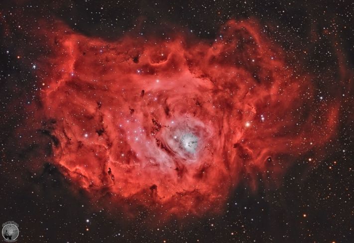 说明:在壮丽的礁湖星云之内,到处都是炽热的气体和年轻恒星。跨幅约100 光年、距离在5千光年左右的礁湖星云,是如此庞大与明亮,不需动用望远镜也能在北天的人马座方向见到它。在这团星云里,可见到刚在数百万年前诞生的疏散星团NGC 6530之众多亮星。这团又名为M8及NGC 6523的大星云,因星团中心左侧的数道尘埃带而获得礁湖星云的雅号。这幅三色影像里的细微结构,因受到氢发出的泛红辉光之照射而轻晰可辨。此外,这团星云拥有许多尘埃云球,证实礁湖星云的恒星诞生活动仍然持续在进行。